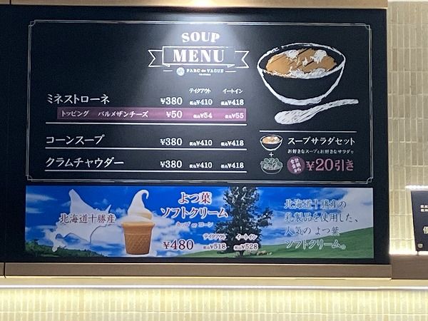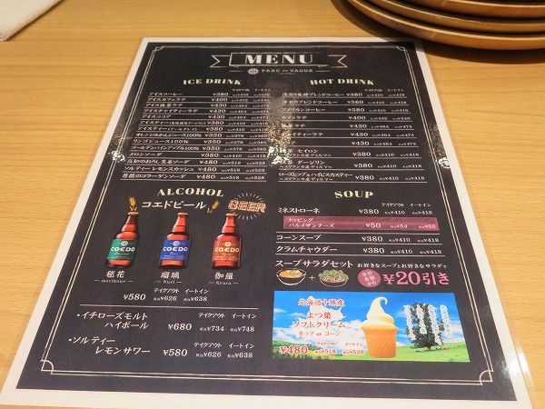 メニューを見ると、ドリンク以外にも、スープやよつ葉乳業のソフトクリーム、さらにお酒好きには嬉しいコエドビールやイチローズモルトのハイボールなどのアルコールも楽しめるようです。
