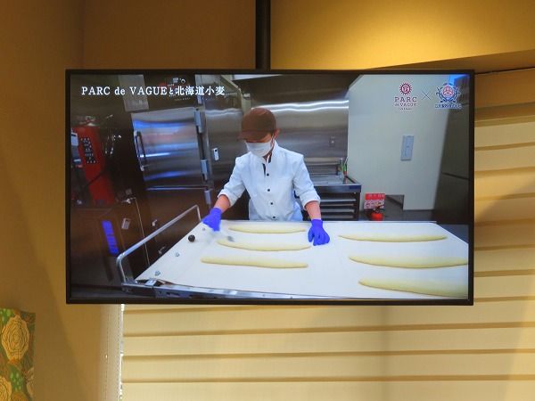 モニターでは、こだわりの小麦粉作りからパンになるまでの映像が流れています。