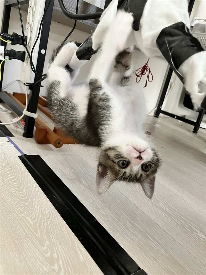 さかさまになっているこの子は、@hina20221019さんの愛猫『もも』くん。 配線にカバーを施したそうなのですが、結果的にそのおかげでおててでつかみやすくなったみたい。 ももくんにとって、アスレチックになってしまったみたいですね~。