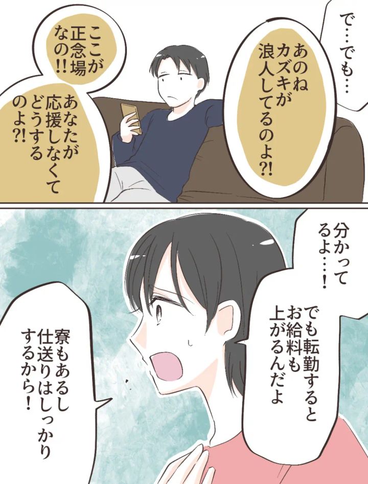 マサミさんは「分かってるよ・・・!でも転勤するとお給料も上がるんだよ。寮もあるし仕送りはしっかりするから!」と言いました。