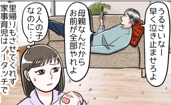 しかし、元夫の態度は産後さらに悪化。「僕がしっかりサポートします!」と友人の実母に言った元夫は、里帰りをさせなかったそうです。それにもかかわらず、家事育児すべてノータッチでした。