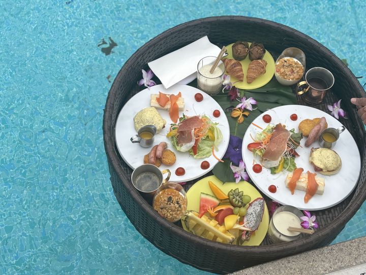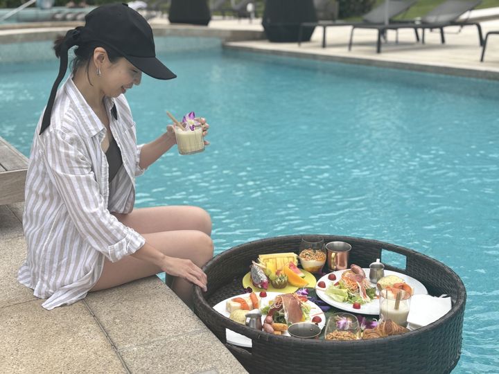 そうそう、ディナービュッフェのほかにも、こちらのホテルに宿泊したらぜひ味わってほしいのがフローティングブレックファスト。朝日がきらめくプールに大きなトレー、そのなかには色とりどりのフルーツ、サラダ、エッグベネディクト。まるで雑誌の一ページから飛び出してきたかのような朝食に朝から、ときめくこと必須!