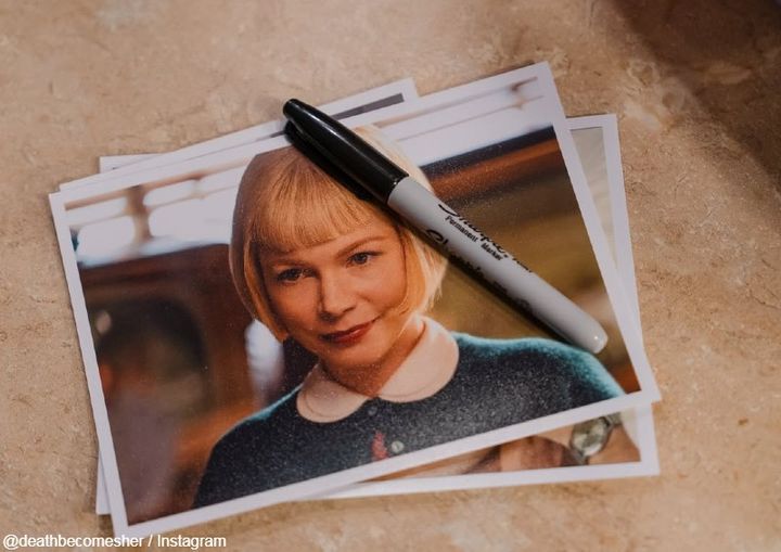 すると、彼女はある写真をカメラに向けて見せる。それは女優ミシェル・ウィリアムズのポートレートだった。「これ、また届いたのよ。私にサインしてほしいって」と、過去にも何度か間違って送られてきたという女優の写真を紹介。続けて、「もうね、私は彼女じゃないの(笑)」とおどけてみせる。