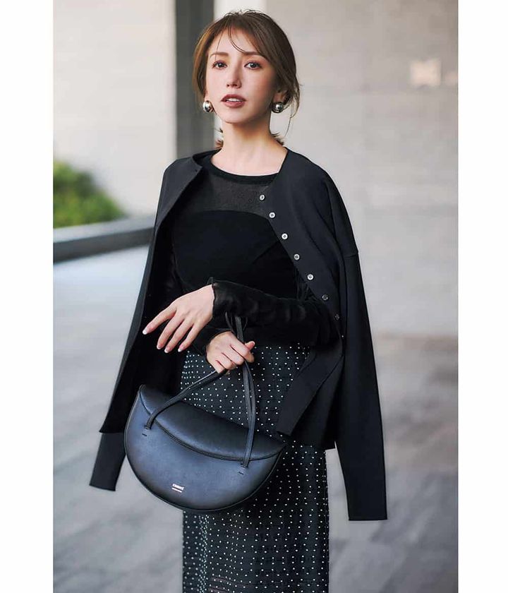 フロッキートップス¥16,500(ウィム ガゼット/ウィム ガゼット 玉川髙島屋S・C店)カーディガン¥63,800(ビロット/サードマガジン)スカート¥77,000(デパリエ/デパリエ 伊勢丹新宿店)バッグ¥39,600(ラシット/ラシット 西銀座店)パンプス¥23,100(オデット エ オディール/オデット エ オディール 新宿店)ピアス¥22,000※片耳価格(マユ/マユ ショールーム)