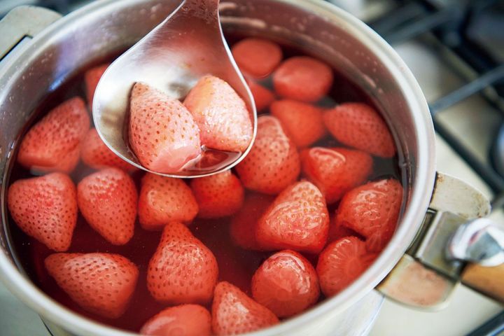 (1)いちごはへたを取る。鍋にいちご、レモン汁、砂糖を入れて混ぜ、砂糖が溶けるまで10分ほどおく。水1lを入れて中火にかけ、煮立ったら弱めの中火にする。ときどきアクを取りながら、いちごが白っぽくなるまで15分ほど煮て火を止める。