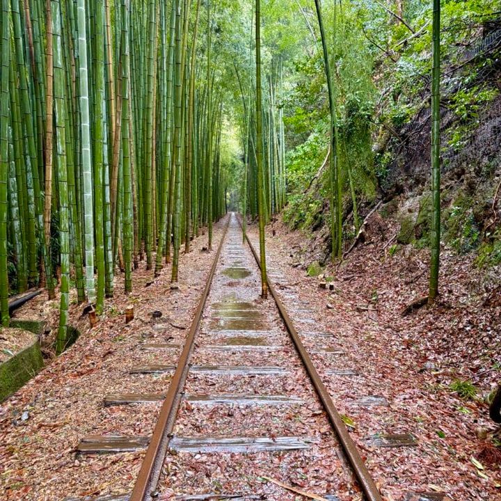 散策ルートのなかでイチオシの絶景はこの竹林エリア!線路の脇には背の高い竹が立ち並んでおり、美しく神秘的な光景が広がっています。よ〜く見ると線路のなかにも竹が生えていて、生命力の強さを実感。 訪問時はあいにくの雨だったのですが、響き渡る雨音やしっとりとした空気が広がり、幻想的な雰囲気に包まれていました。 鉄道や廃線の歴史に詳しくなくても気軽に散策できるので、ぜひ訪れてみてくださいね。