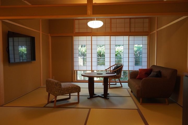 書院造の本館2階の「松」の客室は137.9㎡という広さで、レギュラーベッドが2台。3~6名で泊まる場合は広い和室に布団が敷かれます。3世代ファミリーやグループでの利用が多いそうです。