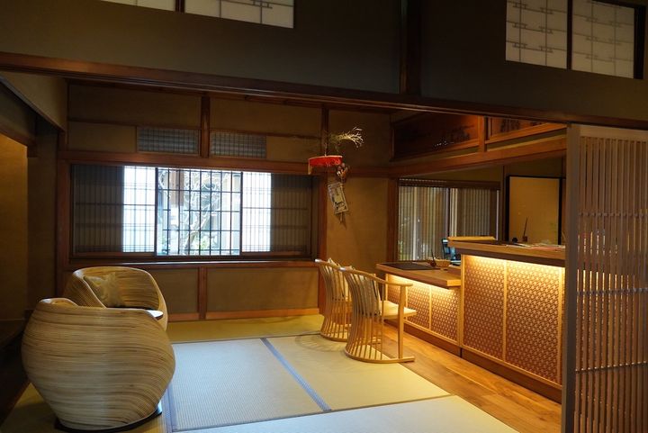 案内されたのは広いダイニング。伝統的な書院造りに京都在住の著名な和紙デザイナー・堀木エリ子さんによる光壁や光柱、障子和紙などがあしらわれています。堀木さんが過去に作られたさまざまな和紙を組み合わせた欄間がとっても素敵。ここでチェックインの手続きをします。