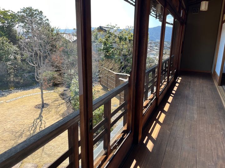 2階の広縁からは、有名な庭師、重森三玲氏が設計した庭園を見下ろせます。梅や枝垂れ桜、紅葉といった四季折々に変わる風景に加えて、嵐山や嵯峨野方面の山々も借景に。