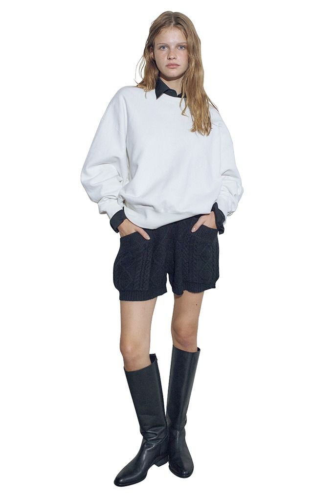 スウェットの隙間をシャツで埋めて、ミニボトムがヘルシーに見えるよう工夫を凝らして。ドライな白スウェットにシアーな黒シャツ、ケーブル編みの黒ニットパンツと、素材もコントラストをつけるのが差を生むポイント。