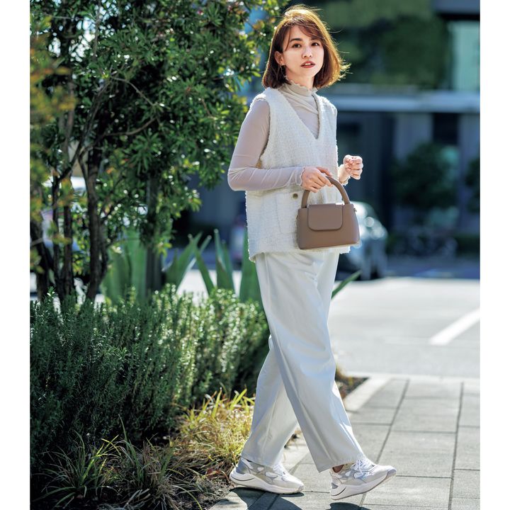 アウトソール5cm、インソール2.5cm。踵に高さが出るよう設計され脚長効果抜群のデイト。流行の全身ホワイトコーデの足元は、メタリックと白のバイカラーがアクセントに。スニーカー[H5cm]¥41,800(デイト/ティースクエア プレスルーム)ベスト¥19,800(ストラ) カットソー¥1,590(神戸レタス)バッグ¥5,800(Olu.) パンツ¥23,100(アルページュストーリー) ピアス¥58,300 ブレスレット¥118,800(ともにココシュニック)
