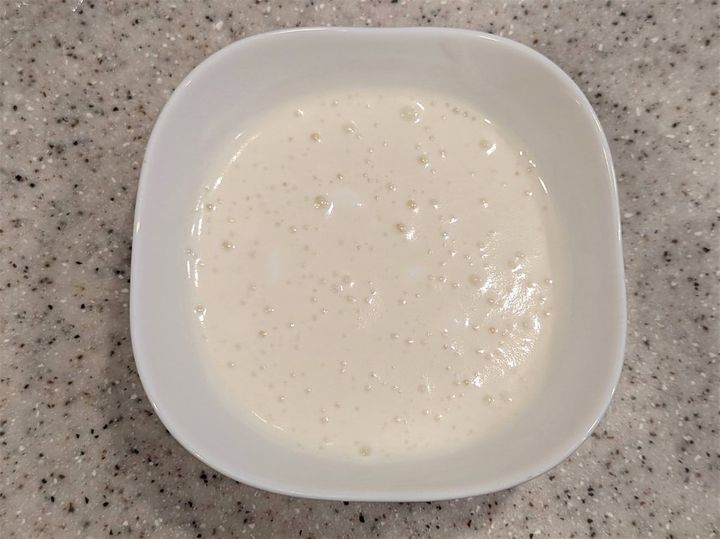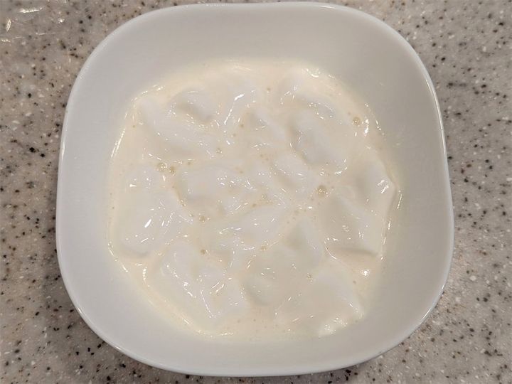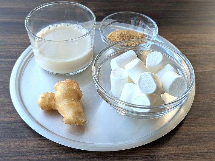 1. マシュマロと豆乳を耐熱容器に入れ、レンジ(600W)で1分程加熱する。マシュマロが溶けるまでかき混ぜる。