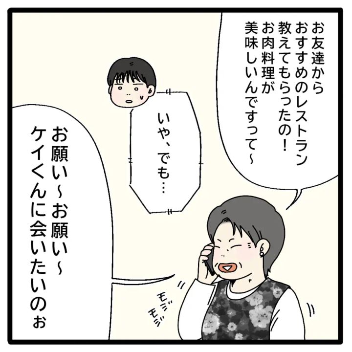 「お友達からおすすめのレストラン教えてもらったの!お肉料理が美味しいんですって~」義母にそう言われた夫は「いや、でも・・」と板挟みになって困っていました。「お願い~お願い~ケイくんに会いたいのぉ」と義母に言われてしまうと、夫としては無下にするのは心苦しいのでしょう。
