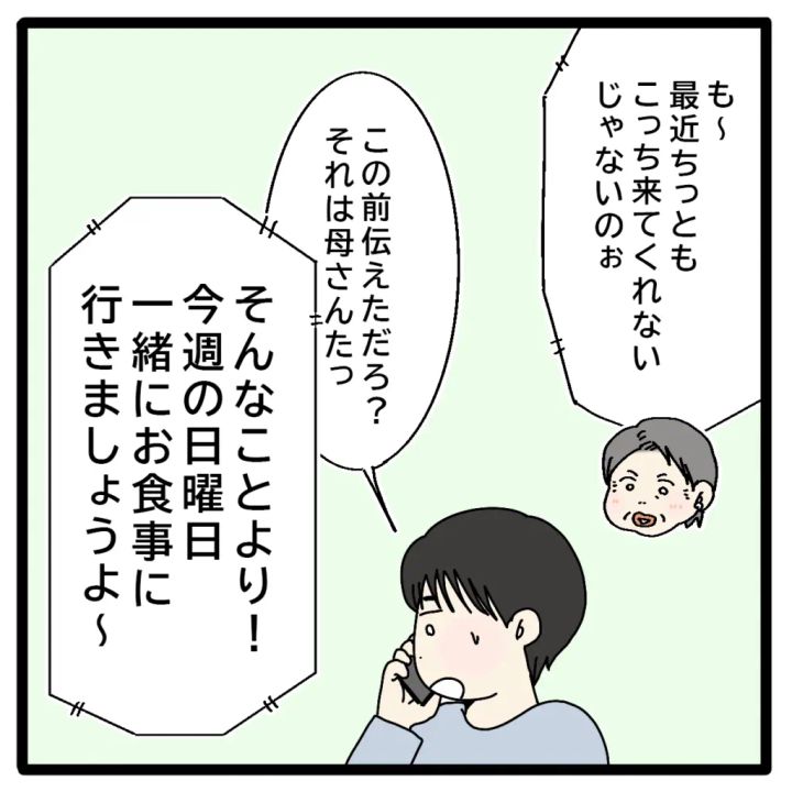 「も~最近ちっともこっち来てくれないじゃないのぉ」義母にそう言われた夫は、「この前伝えただろ?それは母さんた・・」と言いかけましたが、義母はお構いなしに「そんなことより!今週の日曜日、一緒にお食事に行きましょうよ~」と誘いました。