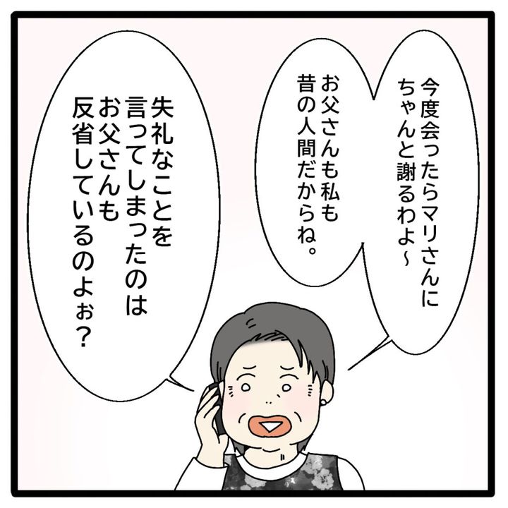 そして、「今度会ったらマリさんにちゃんと謝るわよ~。お父さんも私も昔の人間だからね。失礼なことを言ってしまったのは、お父さんも反省しているのよぉ?」正直、反省しているとは思えませんでしたが、久しぶりに義理の父母に会うことになります。