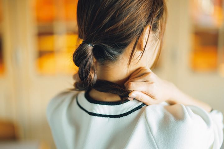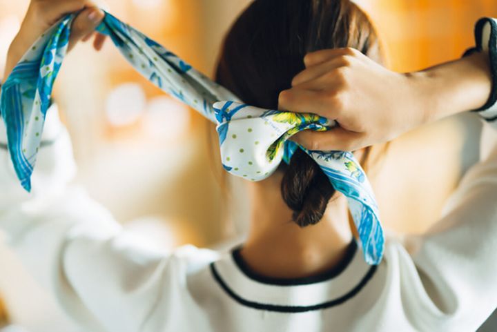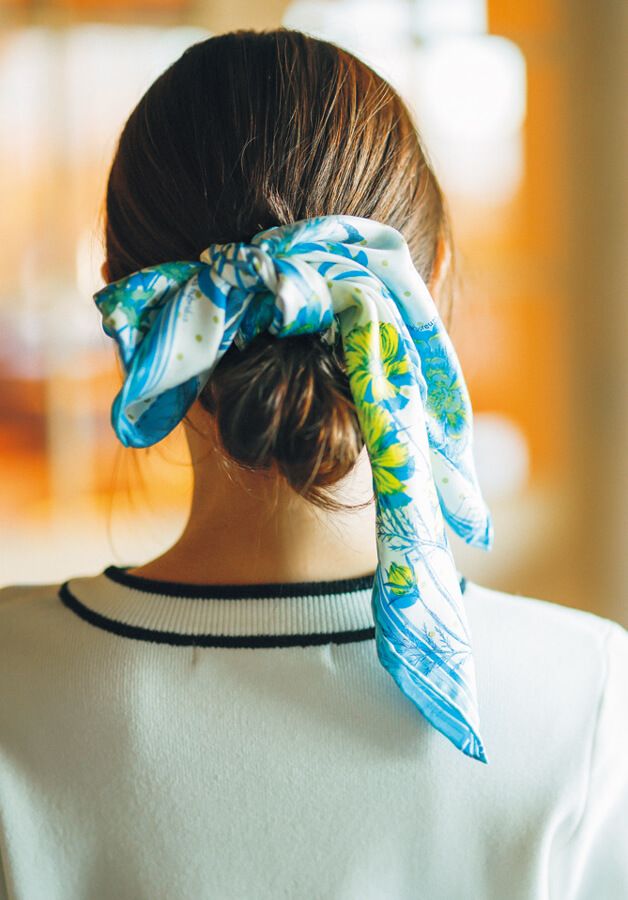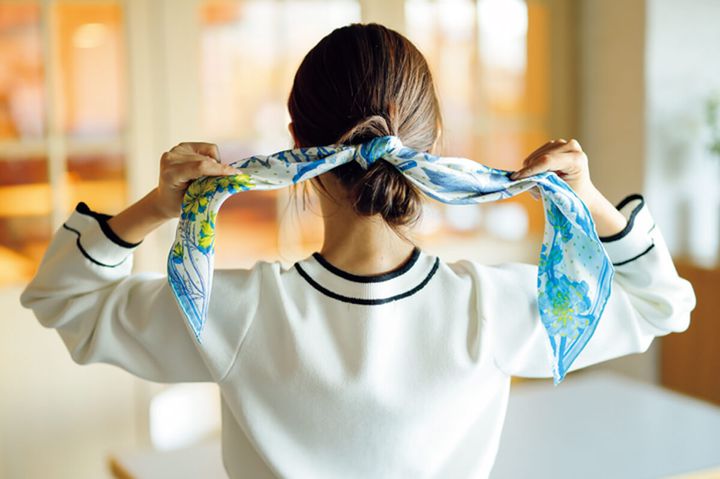 2.髪の結び目の上から、バイアス折りにしたスカーフを片方が少し長くなるようにひと結びにする。