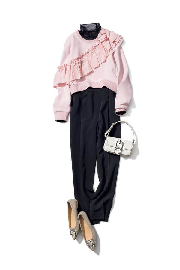 ピンク&フリル付きのキャッチ―なスウェットとなら、黒パンツが重く見えずキュート♡首元に小粒のきらめきもトッピング。