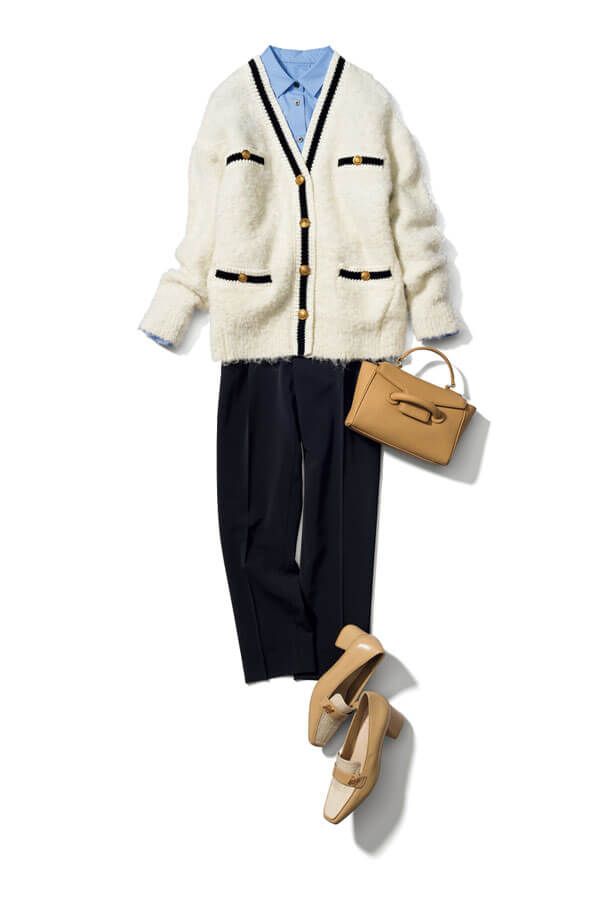 パンツ/着回し(下記詳細) カーディガン¥22,000/アルページュ ストーリー シャツ¥7,990/UNFILO(オンワード樫山) バッグ¥50,600/VASIC(ヴァジックジャパン) 靴¥9,900/RANDA