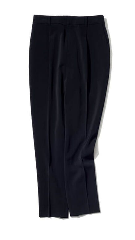 ワードローブの定番として持っておきたい、シンプルなブラック。細すぎずややゆとりのあるシルエット、落ち感ある素材、センタープレス入りの3条件を満たす1本が使いやすい!