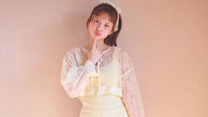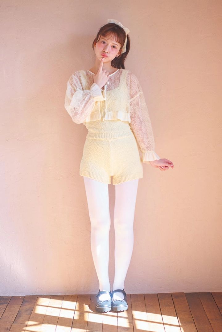 フラワーチュールブラウス 8,800円/merry jenny ニットキャミソール 10,030円、ニットパンツ 10,550円/ともにミーンデリ(HANA KOREA)リボンヘアゴム 1,890円/NADIA FLORES EN EL CORAZON 厚底シューズ 12,650円/アルテミス by ダイアナ(アルテミス by ダイアナ アーバンドック ららぽーと豊洲店)タイツ/スタイリスト私物