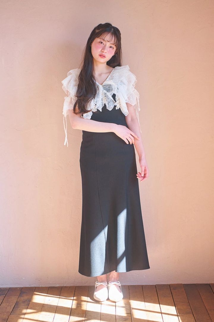 ブラックワンピには、レースで甘さをほんのりプラスして!
