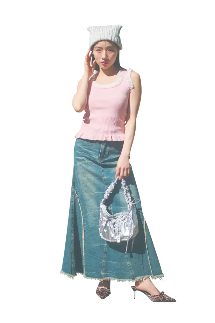 ピンクニットタンクトップ 3,990円/NADIA FLORES EN EL CORAZON デニムスカート 5,499円/WEGO ビーニー 5,500円/OVERRIDE(OVERRIDE 神宮前)バッグ 6,919円/Silly by Lit’s ミュール 6,590円/ZARA(ザラ)