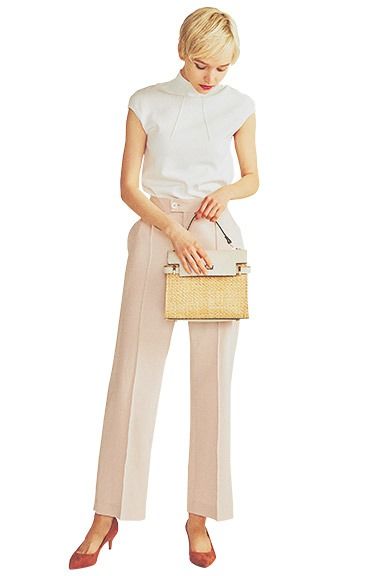 「フォルムは紳士・色みはLADY」のギャップが、可愛い色を上手にとり入れるコツ。センタープレス×ストレートラインの美形につながるソフトなピンク。ハイネックトップスとの端正なものどうしで、やさしい配色をほどよくシャープなたたずまいへ。
