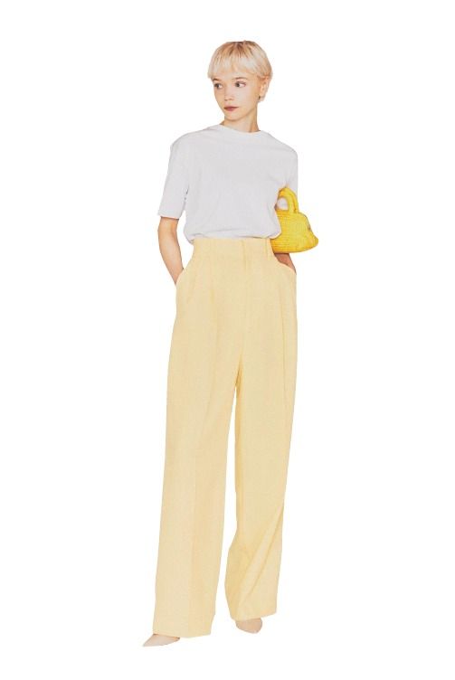 イエローは肌なじみもよく、まるでベージュパンツのような立ち振る舞いをする、たまごの黄身のような色味を選ぶのがポイント。なめらかな質感が、色の印象をよりマイルドに見せてくれる。ムダのないシルエットとトップスのタックIN効果ですっきりとした印象に。