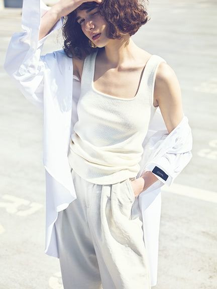 【まじめなシャツをふまじめにまとう】自由度の高い着方こそ大人びた配色で。タンクトップとリネンパンツという力の抜けた上下に、オーバーサイズの白シャツをラフに重ねる。素材やシルエットではラクしても、風格のある3色を選ぶことでねらいどおりの奥行きが完成。