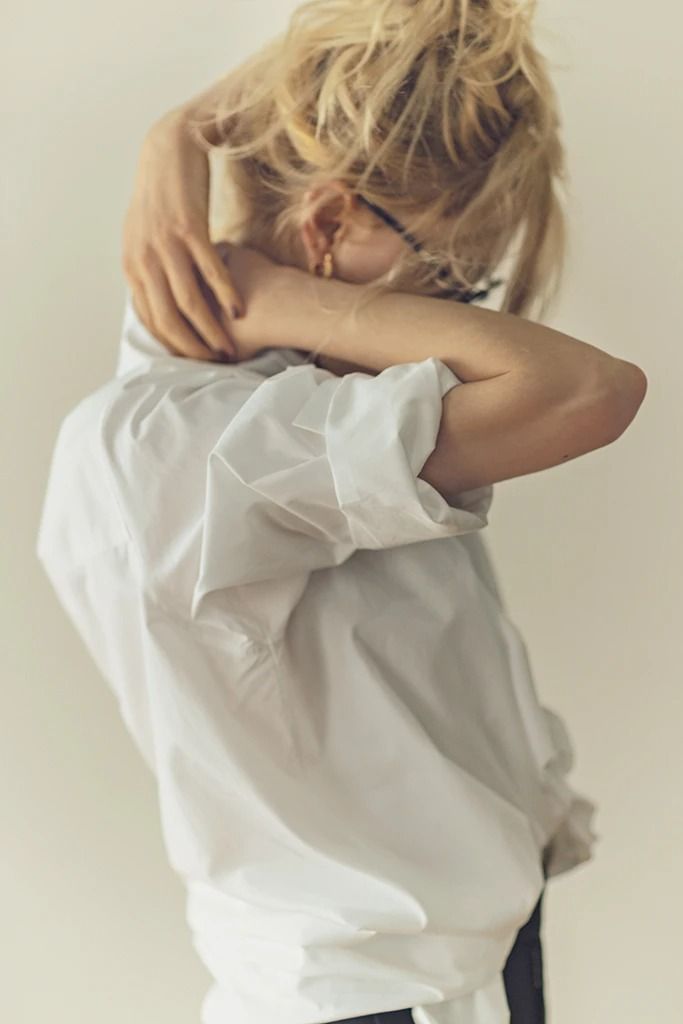 「まず選び方。パリッとした質感も、もちろん良いのですが、そでや肩が落ちるような柔らかな素材とビッグシルエットはいい関係。ビッグシルエット+とろみ素材の組み合わせでできる、そでのたるみや肩が落ちる「たるみ」はほかにない、独特のシルエットを演出してくれます。まじめなイメージの白シャツこそ大胆に着くずしを」(樋口さん)