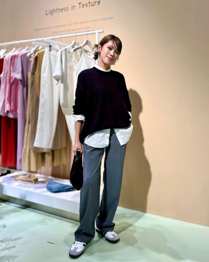 ユニクロでそろえられる、シンプルコーデ。きちんと見えするシャツと、カジュアルアイテムのセーターを合わせることで、ほどよいきれいめカジュアルが叶います♪さまざまな職種の保護者が集まる保育園の保護者会にぴったりの服装です。