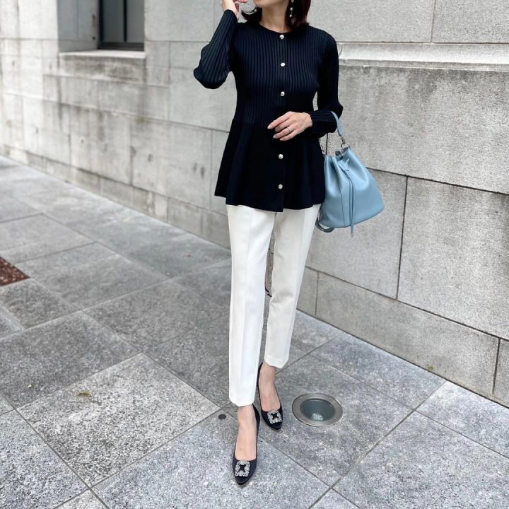 ママたちに人気のペプラムトップス。ウエスト部分の立体的なフレアシルエットで細見えが叶います!また、ネイビー×白の色合わせと、カーディガンのメタルボタンも、上品で大人な雰囲気に見せてくれます。保護者会の服装に悩む40代、50代のママたちも挑戦しやすい服装です♪