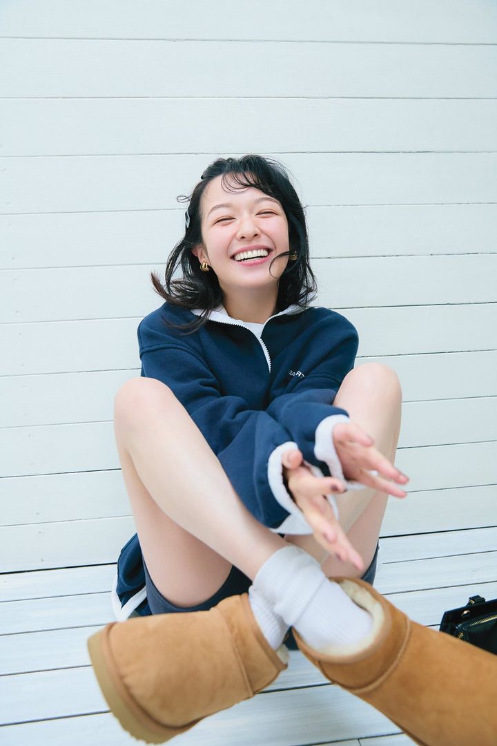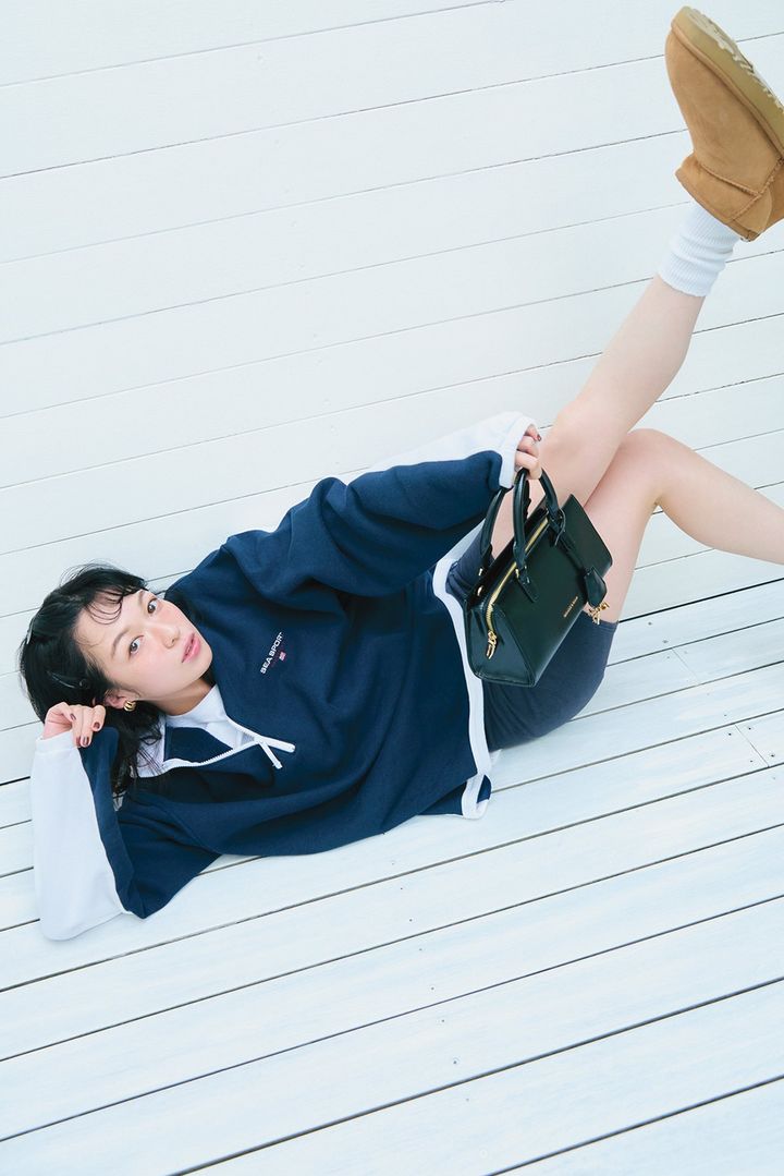 森絵梨佳。ar3・4月合併号より スウェット¥30,800、ショートパンツ¥17,600/シー(エスストア)中に着たTシャツ¥4,400/プチバトー(プチバトー・カスタマーセンター) ピアス¥3,960/KRONOS(ロードス) バッグ¥12,900/チャールズ&キース(チャールズ&キース ジャパン) ブーツ¥24,200/アグ®(デッカーズジャパン)ソックス/スタイリスト私物