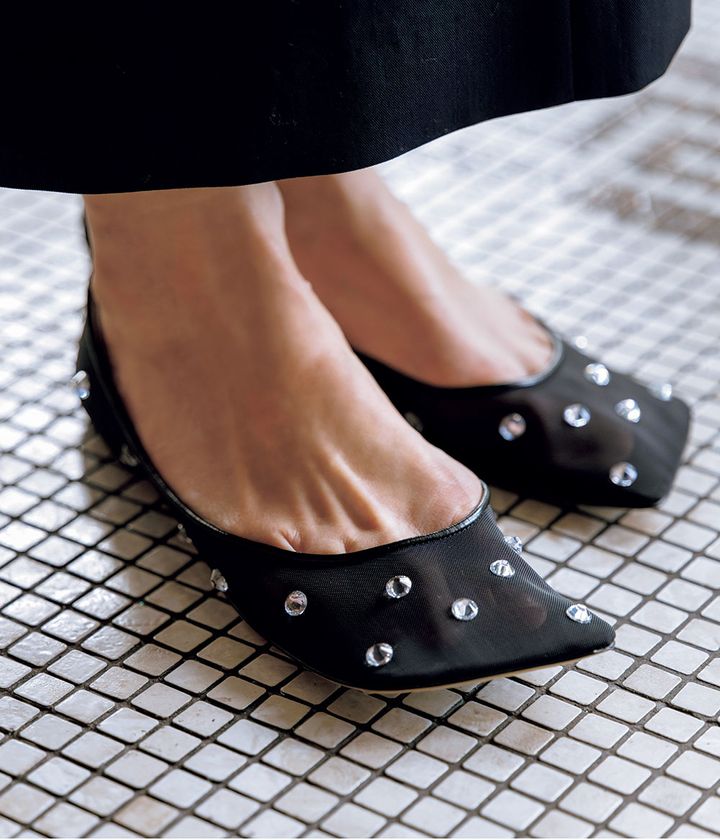 クチュール感がグッドバランス。袖部分のフリルは取り外し可。シアーなキラキラ☆シューズで足元まで抜かりなく。