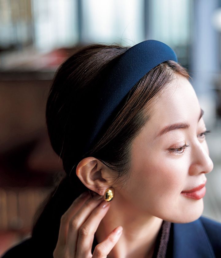 端正なネイビーできちんと感をキープ、ゆるっとしたドロップショルダーとボリューム袖が今どき。顔周りはベロアのカチューシャでシックに。