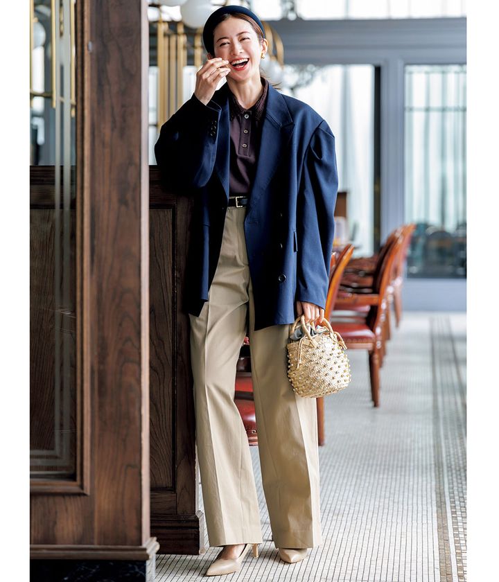 ジャケット¥16,940(グリーンレーベル リラクシング/ユナイテッドアローズ グリーンレーベル リラクシング ルミネ有楽町店)シャツ¥23,100(エーケーワン/デミルクス ビームス 新宿)パンツ¥34,100(イウエン マトフ/ユナイテッドアローズ 六本木ヒルズ店)バッグ¥49,500(プンティ/エルディスト)パンプス¥74,800(ペリーコ/アマン)ピアス¥30,800(ブランイリス/ブランイリス トーキョー)