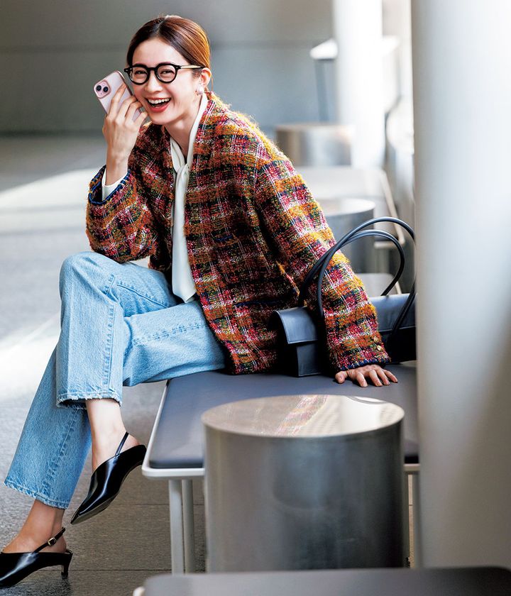 ジャケット¥143,000(キャバン/キャバン 丸の内店)ボウタイブラウス¥16,500(ノーブル/ノーブル 有楽町マルイ店)デニムパンツ¥36,300(エブール/リトルリーグ インク)バッグ¥44,000(モフィオラ/アマン)パンプス¥27,500(オデット エ オディール/オデット エ オディール 新宿店)メガネ¥49,500(モスコット/モスコット トウキョウ)イヤリング¥6,480(アビステ)