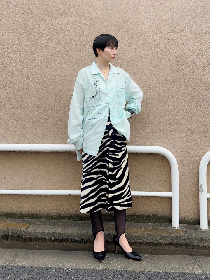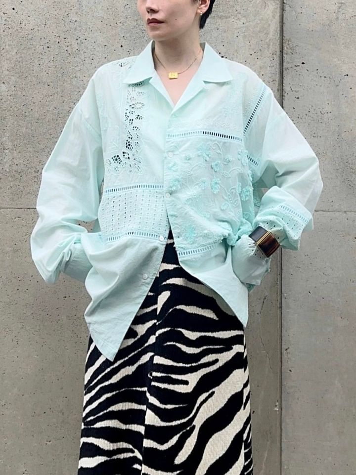 「カットワークや立体刺繡、シフリ刺繍などさまざまな種類の刺繍を施し、はしごレースでパッチワーク状に組み合わせた開襟シャツに、ゼブラ柄のスカートを合わせてコーディネート。柄×柄のスタイリングですが、軽やかなシャツの風合いと爽やかなグリーンのカラーが柔らかい雰囲気に落とし込んでくれます。メッシュのレギンスをレイヤードして、足元の装いもアップデートしました」
