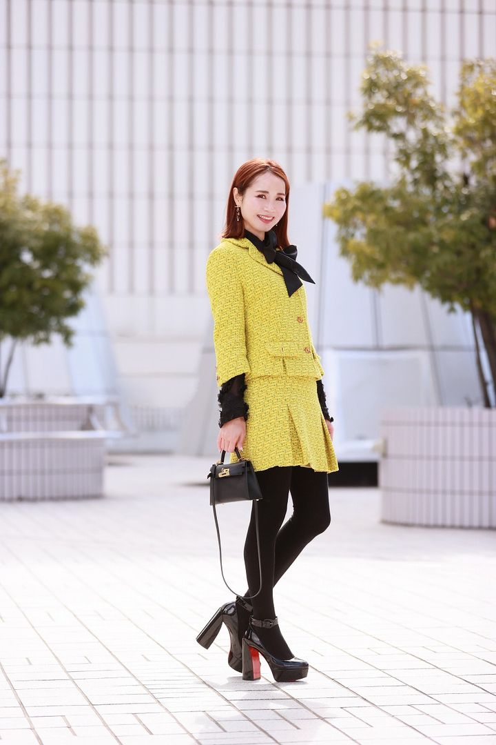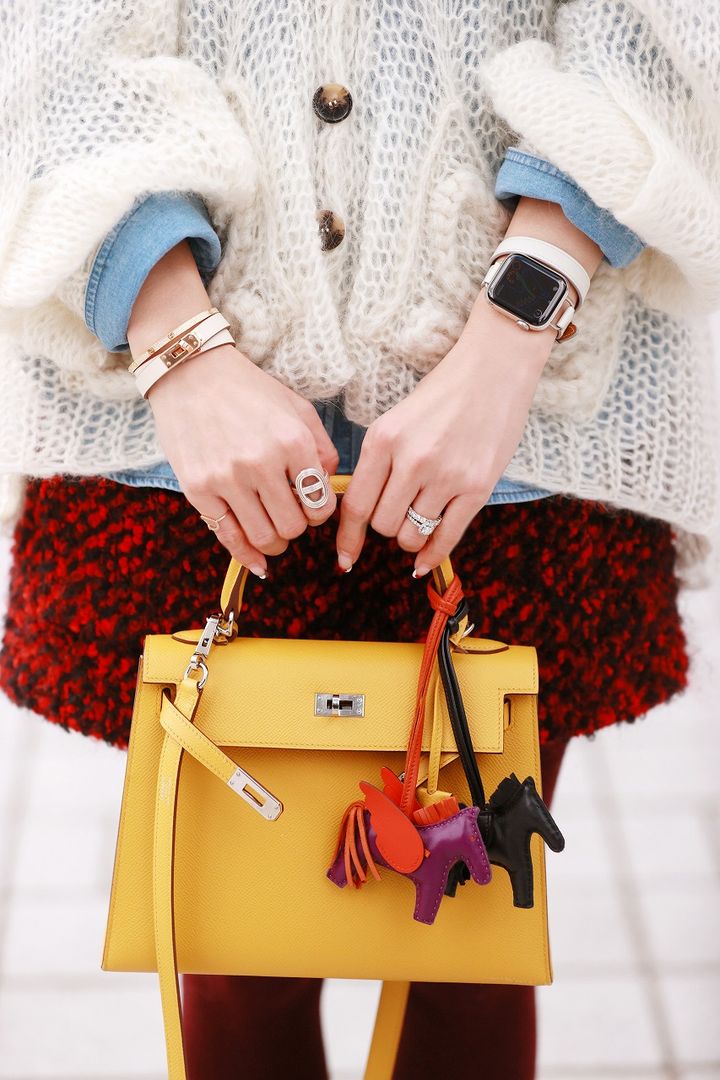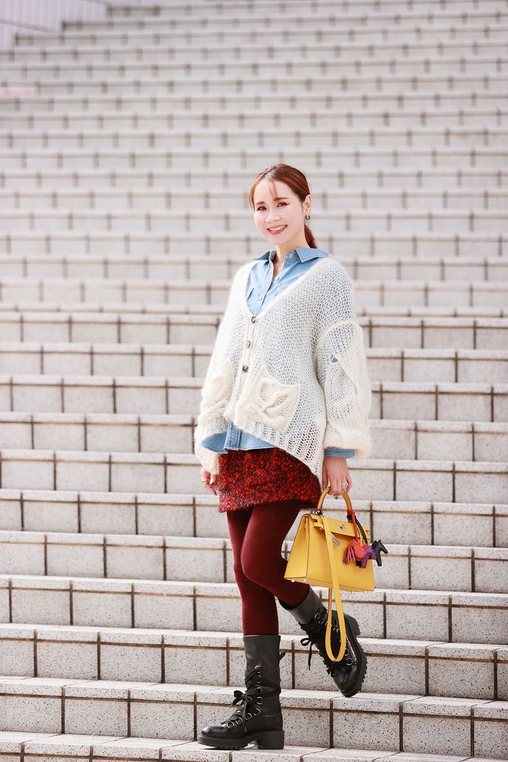 エルメスは私にとって、憧れの塊でした。若い時は頑張って背伸びして持っている感じがありましたが、最近ようやく気負わずに持てるようになってきたかな…と思い始めていました。年齢を重ねて、カッコよく持っている女性に憧れます。4年ほど前に購入したケリーは明るすぎず、落ち着きすぎていないイエローに惹かれました。複数チャームをプラスして、さらっと持つのが好み。360度どこから見てもかわいいロエベのカーディガンを主役にして、大好きなヌメロのツイードスカートを合わせて、クラスアップしたカジュアルコーデに仕上げました。