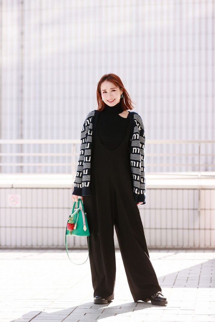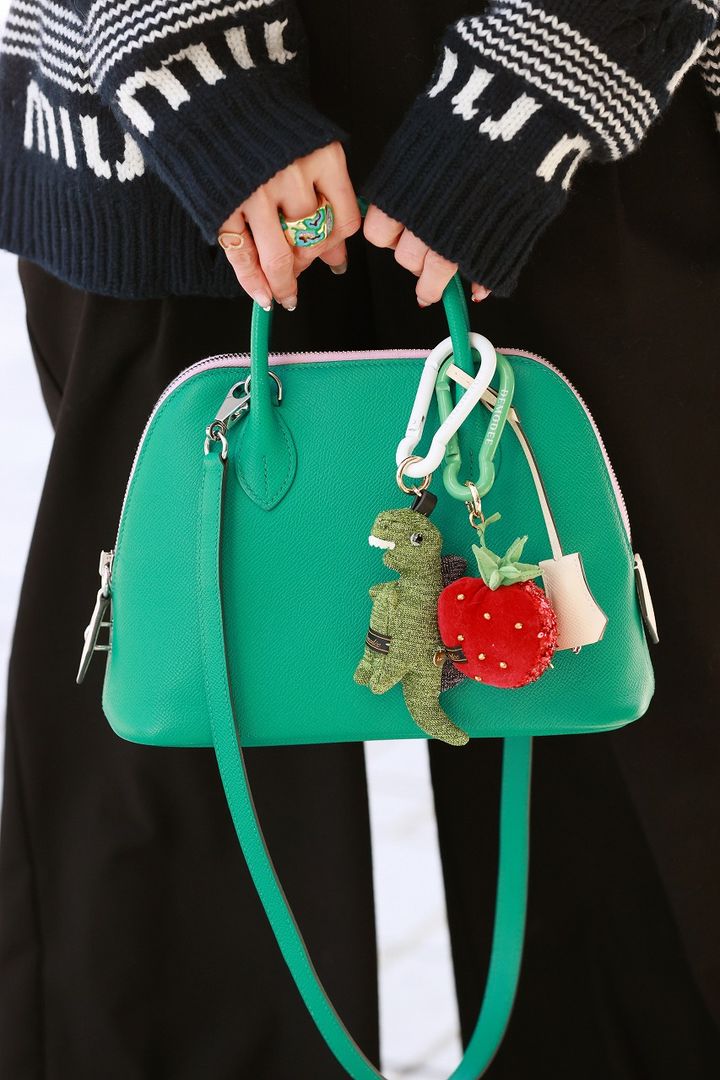 3年ほど前、トリコロールのグリーンのボリードは、大きさも形も色も全てが完璧に好みで、雑誌に載っていて一目惚れしたもの。よく見るとジップがピンクで可愛さアップ! 使い勝手がよく、グリーンがコーデのポイントになるので登場回数が多いです。ブラックコーデに、Miu MiuのロゴとDEMODEEのポップなチャームでキュートさをプラスしました。