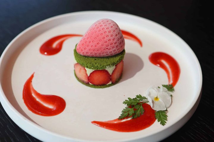 緑のグリーンピースをペーストにしたクリームを忍ばせ、トップにまるで苺のようなラズベリーシャーベットを飾った、苺畑をイメージしたフレジェ。可愛らしい見た目に釘付けのサプライズ感あふれる映えデザートです。甘さ控えめでさっぱりとした味わいのため、ギルトフリーなのも◎。