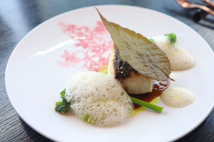 メインは魚か肉から選べます。こちらは、香ばしく焼き上げた鮮魚に素揚げした塩漬けの桜の葉を添え、上品な香りをプラスした魚料理。仔牛の出汁をベースにしたシェリービネガーソースと、野菜の旨味を凝縮したブイヨンソースが口の中で調和し、絶妙なハーモニーを奏でます。