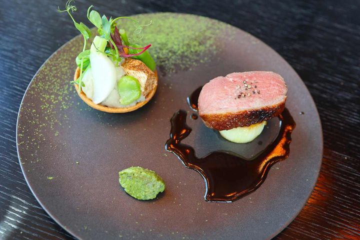 肉料理のストーリー:新緑が芽吹く豊かな土壌「鴨肉のロースト、春野菜のタルト、ふきのとうのコンディメント」