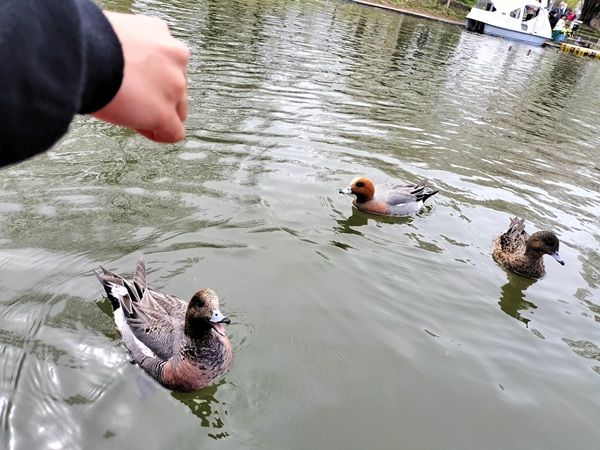 ”コイえさ”と記載されているのでコイがいっぱい集まってくると思いきや…集まってきたのはカモちゃん達!