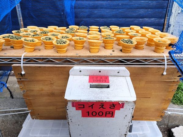 ボート券売り場の前ではコイの餌が販売されていました。アイスクリームコーンに入ったコイえさは初めて!
