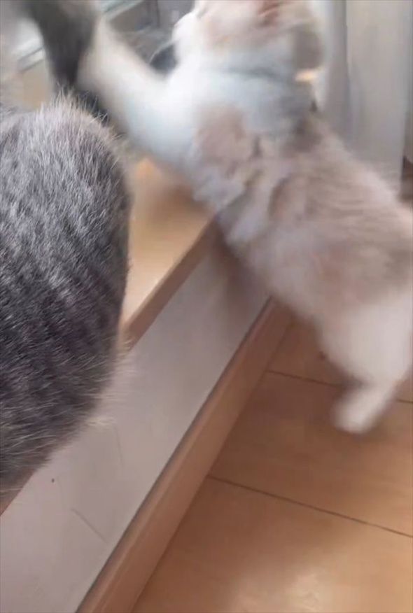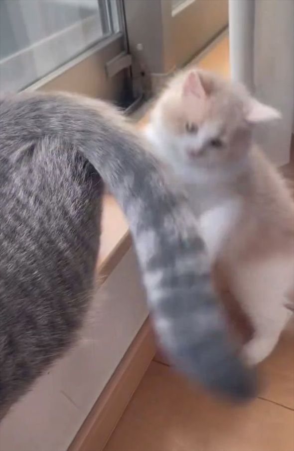 シャカシャカとおててを動かしたり、ちょこまかと動き回る子猫。 この子は、先住猫のしっぽと全力で戦っていました!!