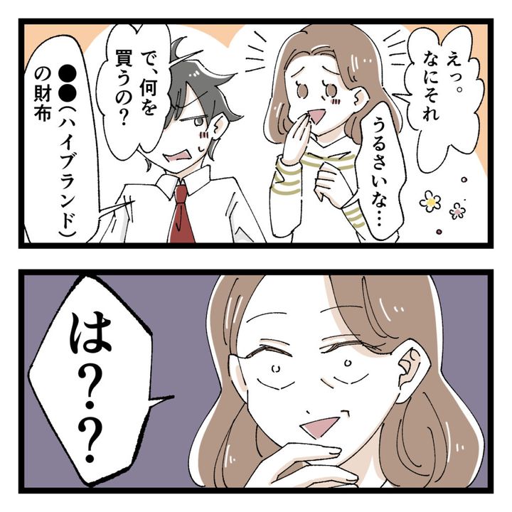 「えっ。なにそれ」と途端にテンションが上がるお母さん。「で、何を買うの?」とワクワクしながらたずねるお母さんに、「うるさいな・・●●(ハイブランド)の財布」とショウくん。