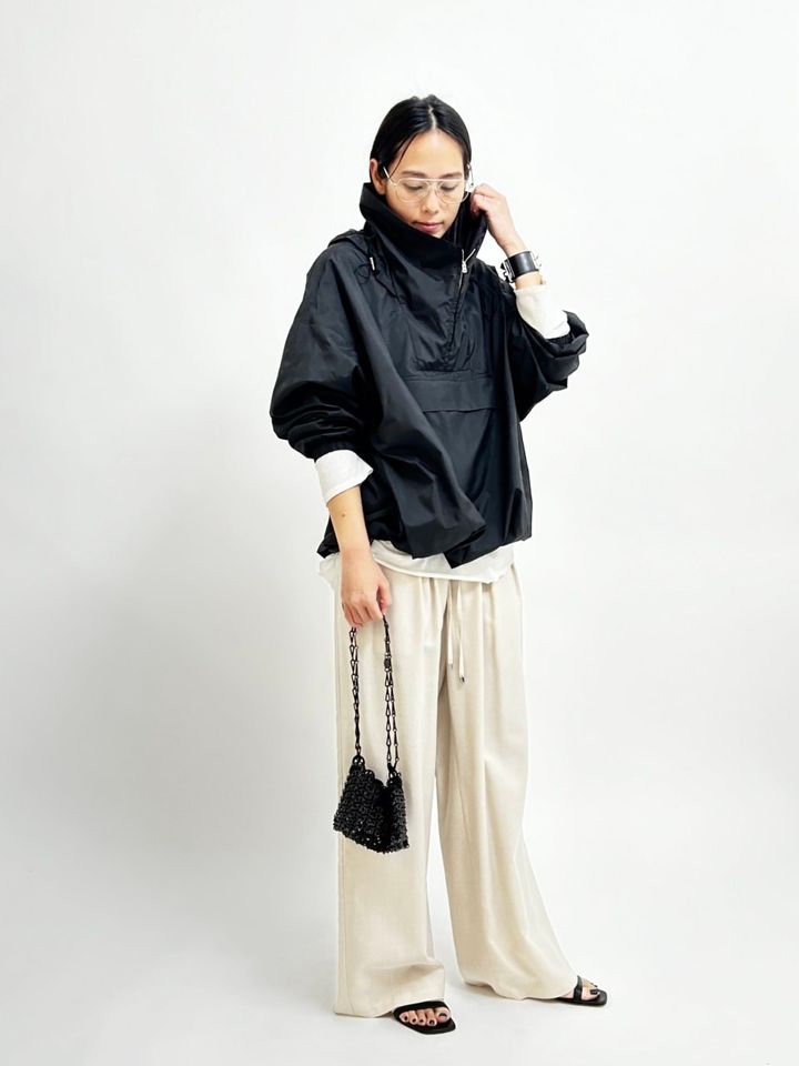 アノラックをシティライクに落とし込むのは、ドレープ感のあるキレイめパンツ。重たくなりがちなブラックのトップスですが、明るいベージュカラーを合わせたり、インナーにホワイトをレイヤードすることで軽やかに決まります。