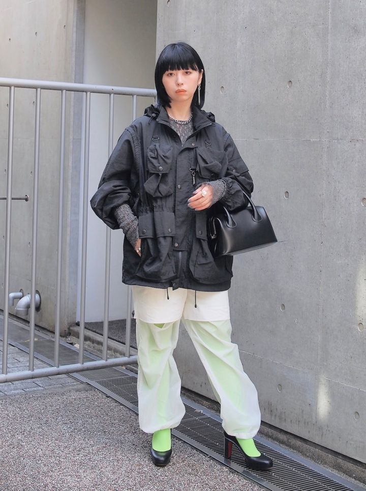 テントラインが存在感のあるナイロン系コートに合わせ、他も同色でまとめたオールブラックコーデ。ほんのり肌見せを入れることで、ヘルシーかつ重たくならないスタイリングに仕上がります。