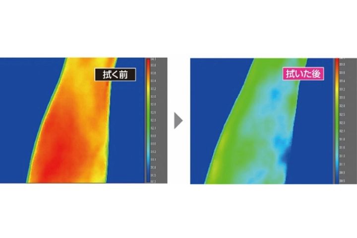 前腕内側部を3往復ふいた直後と拭く前で皮膚表温度を比較(当社調べ)